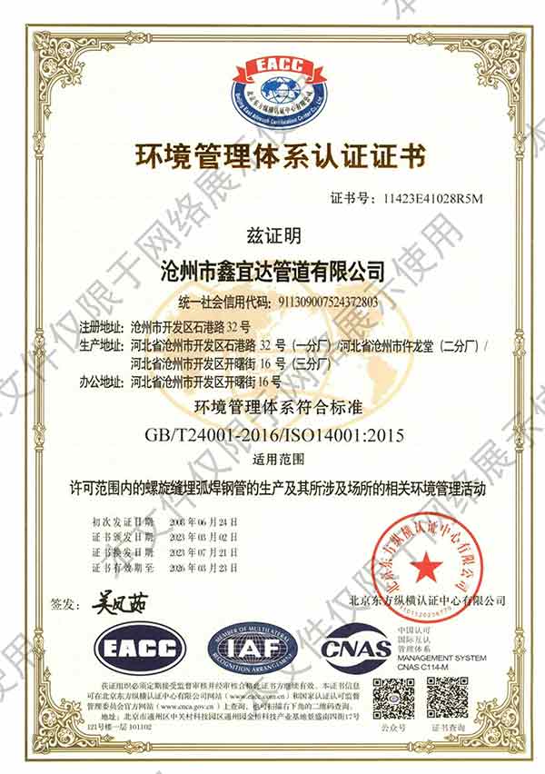 滄州市鑫宜達管道有限公司成立于2003年7月,坐落于滄州經(jīng)濟開發(fā)區(qū),占地面積40萬平方米,注冊資金1.81億元,是集螺旋鋼管生產(chǎn)、防腐加工以及無縫鋼管、卷板、帶鋼等品類鋼材經(jīng)營銷售于一體的工貿型企業(yè)。公司現(xiàn)有員工400多人,其中,中高級技術職稱的人員達120余名。 滄州市鑫宜達管道有限公司擁有9條螺旋鋼管生產(chǎn)線和3PE防腐生產(chǎn)線,可生產(chǎn)直徑219--3640mm,壁厚5.5--28mm,最高鋼級X100的各種規(guī)格防腐螺旋鋼管...